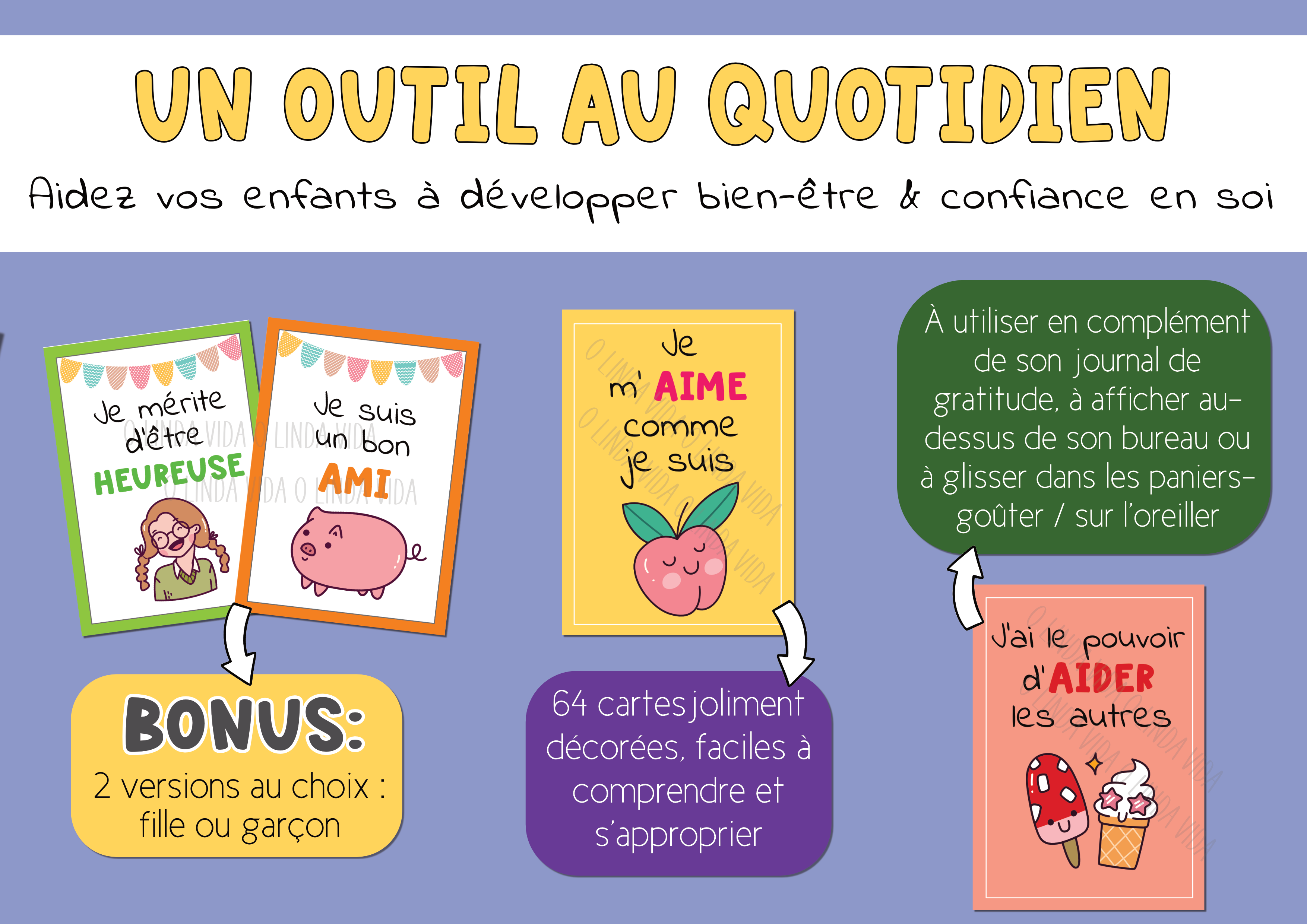 - Des affirmations simples et faciles à comprendre, spécialement pensées pour être accessibles pour votre enfant