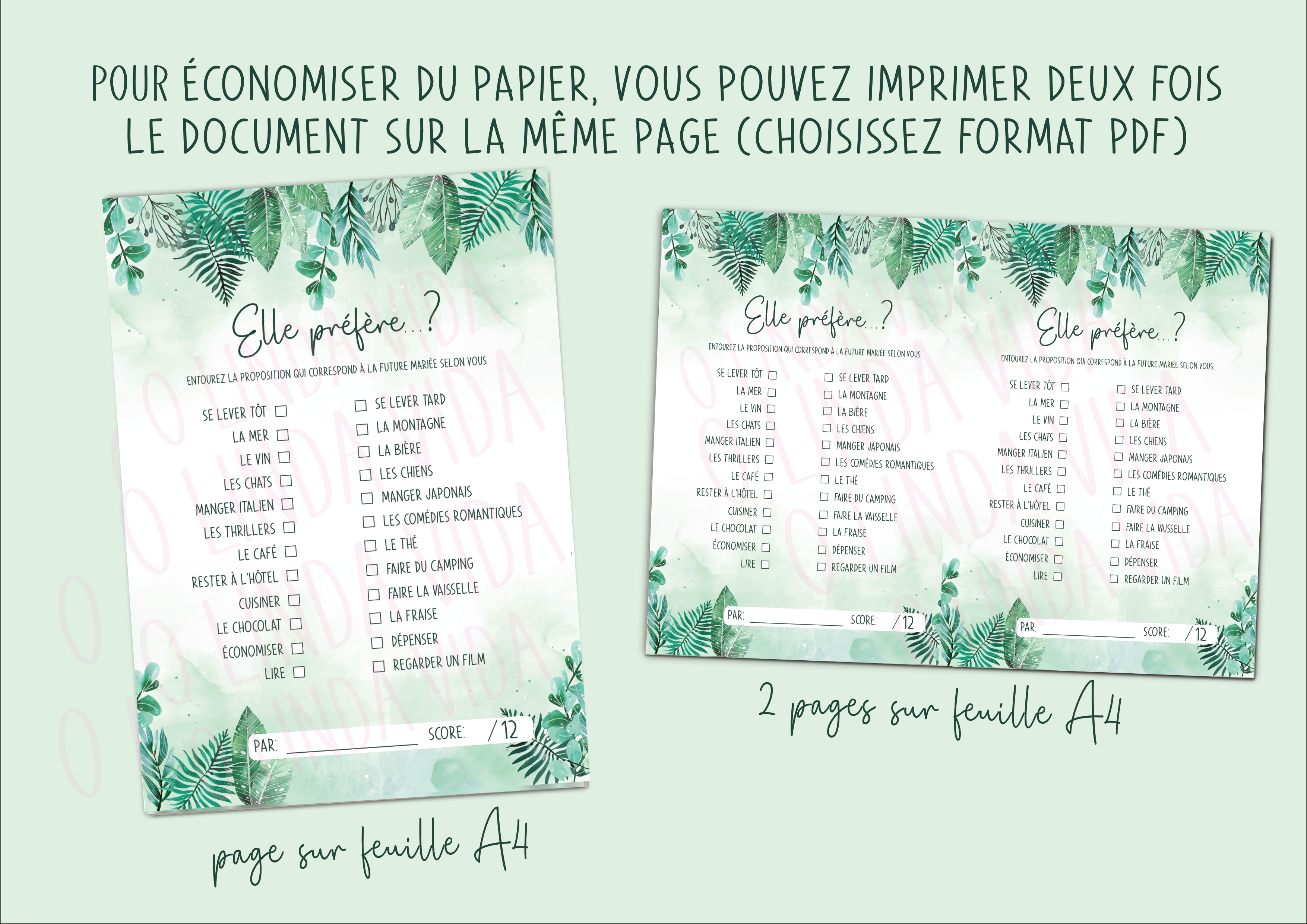 – Ce produit est réservé à un usage personnel. Il est strictement interdit de le partager en dehors de l’événement prévu, de le revendre, modifier ou reproduire les fichiers. En achetant ce produit, vous acceptez les conditions d’utilisation de ma boutique.