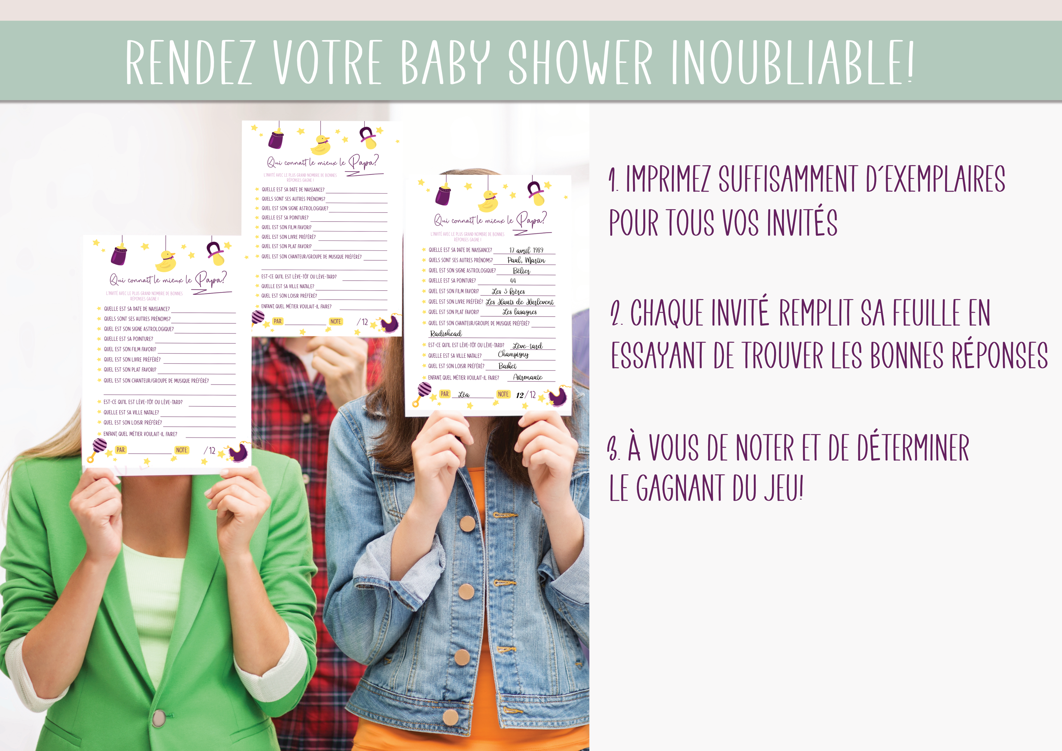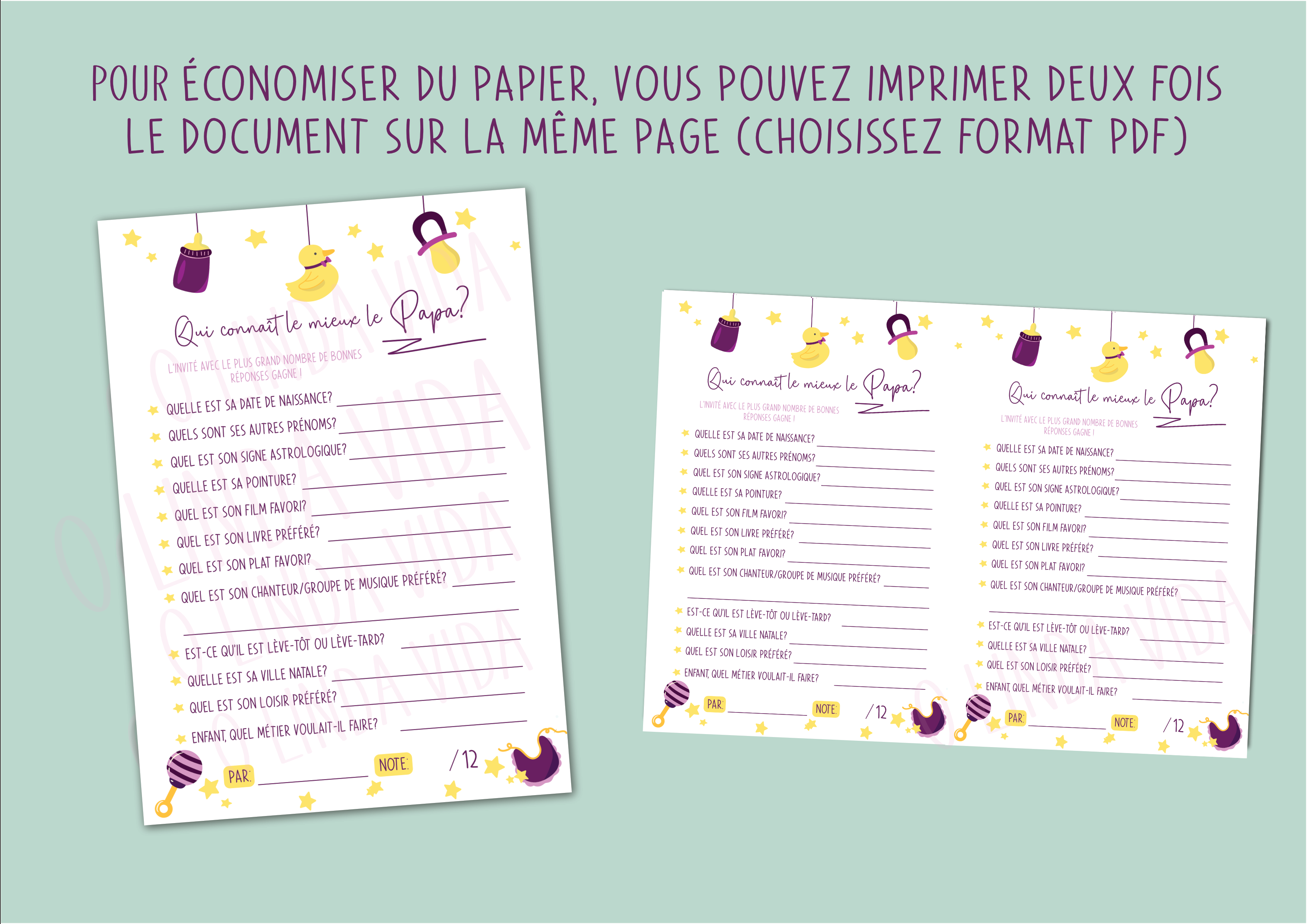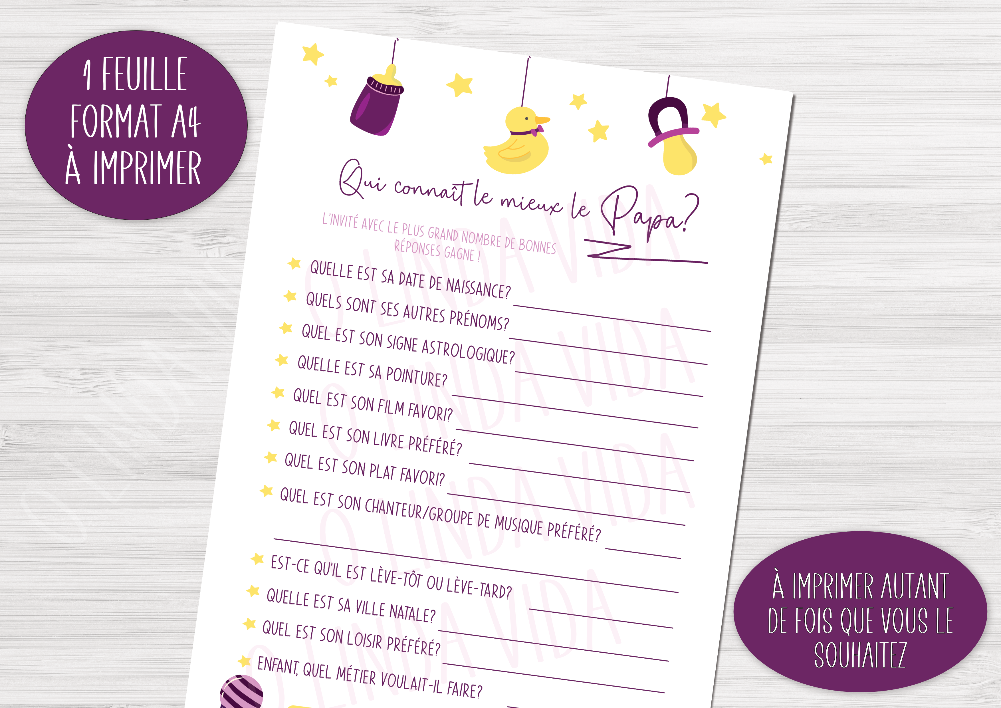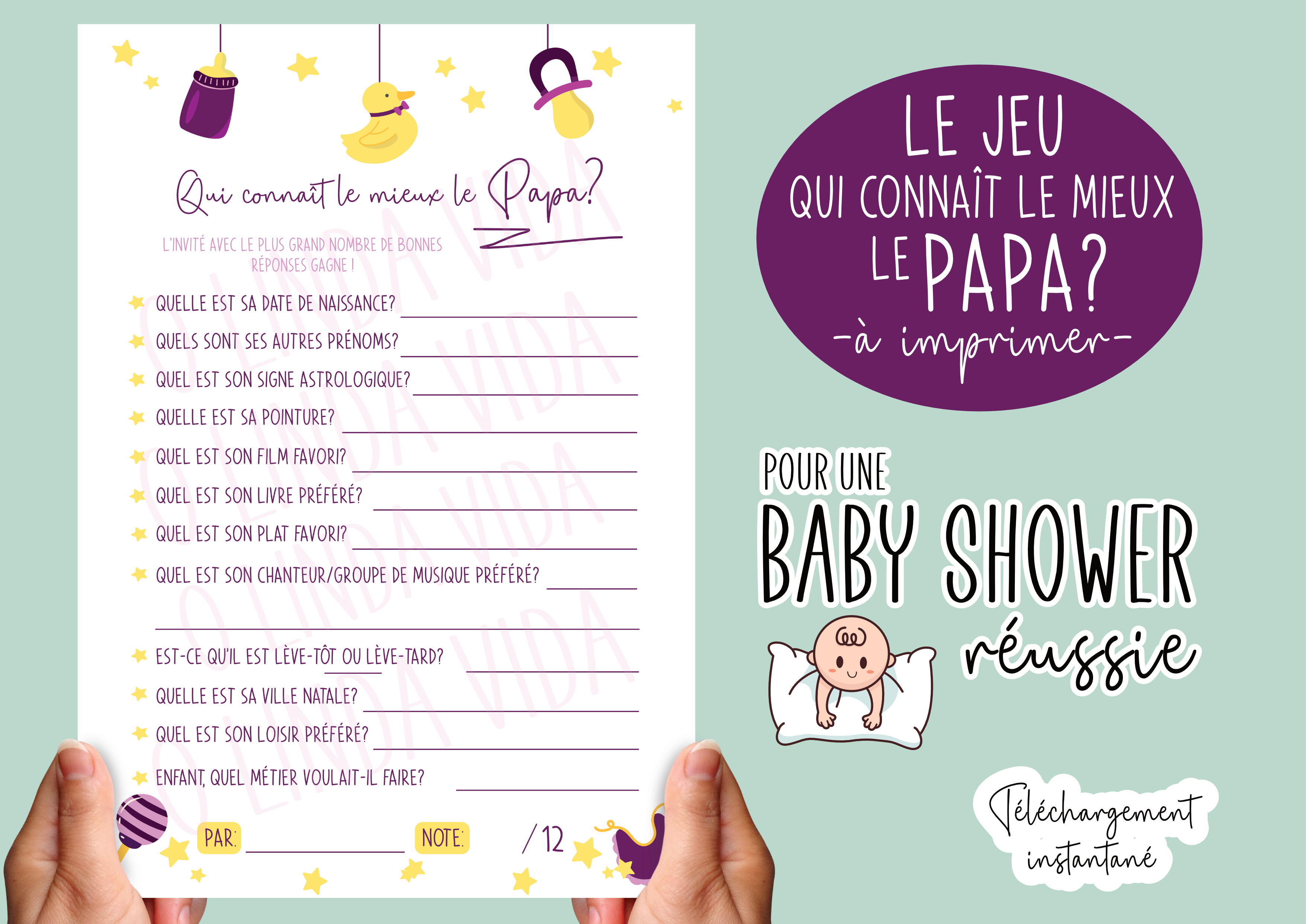 Ajoutez une touche unique à votre Baby Shower avec ce jeu imprimable « Qui connaît le mieux le papa? » (thème Canard), spécialement conçu pour rendre votre événement convivial et inoubliable !